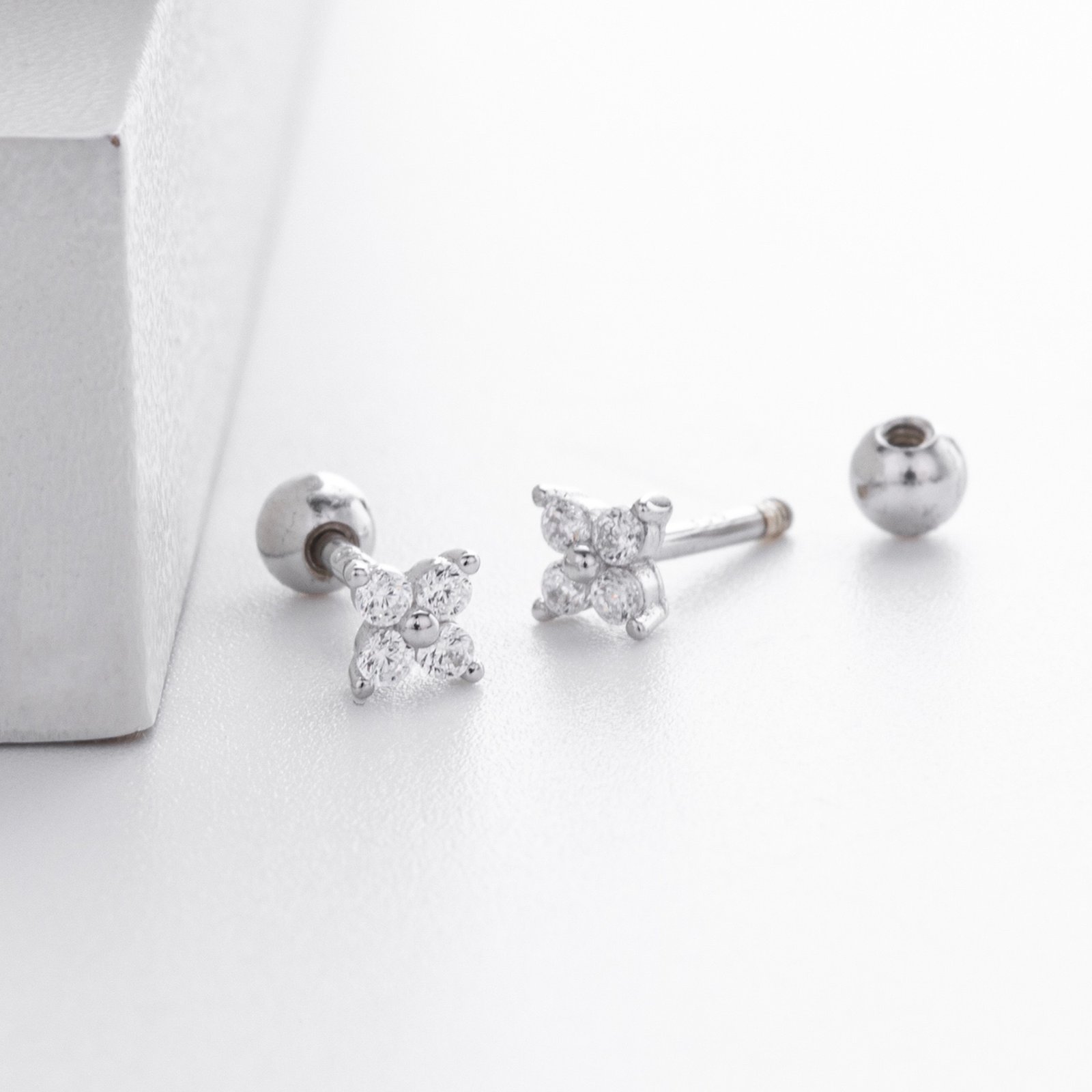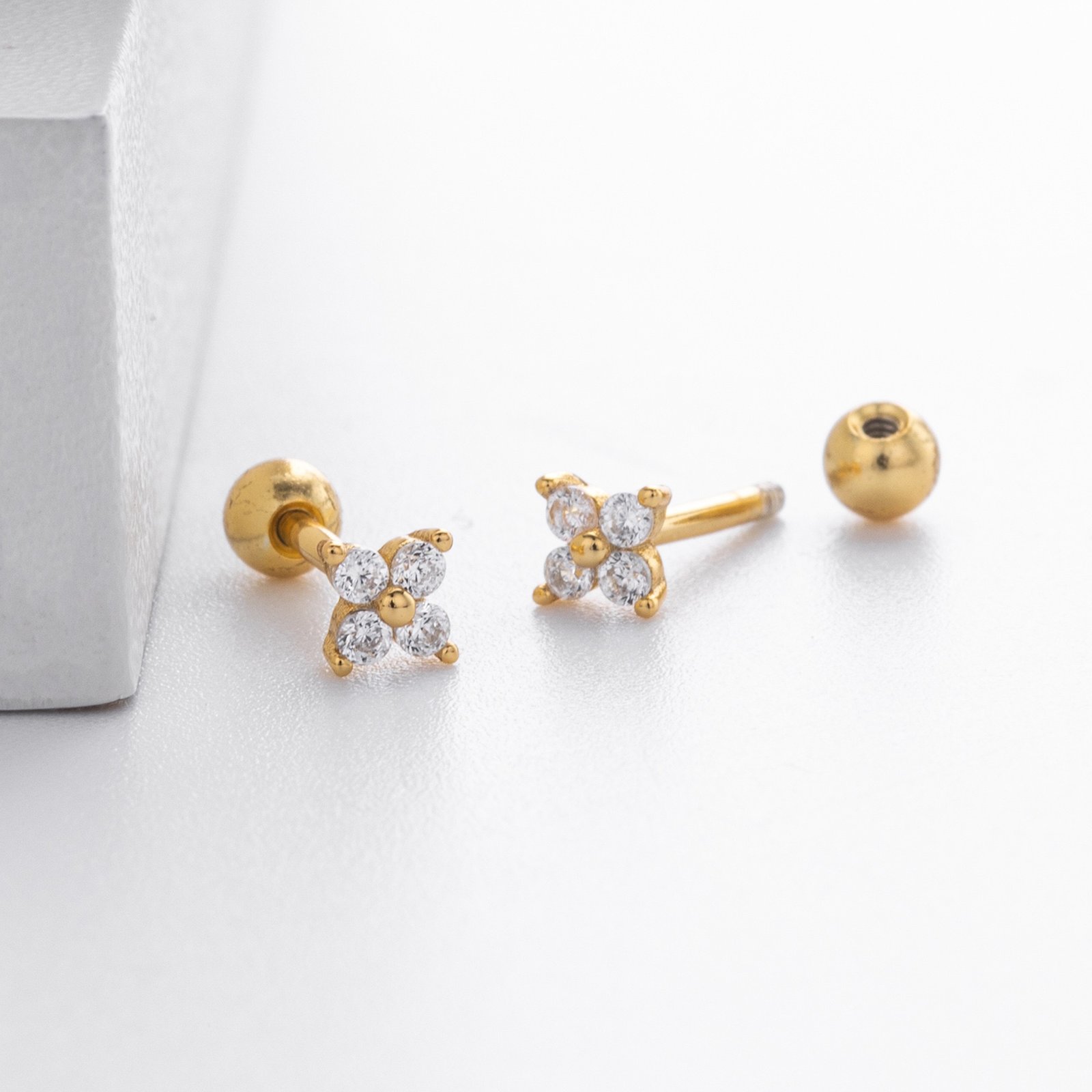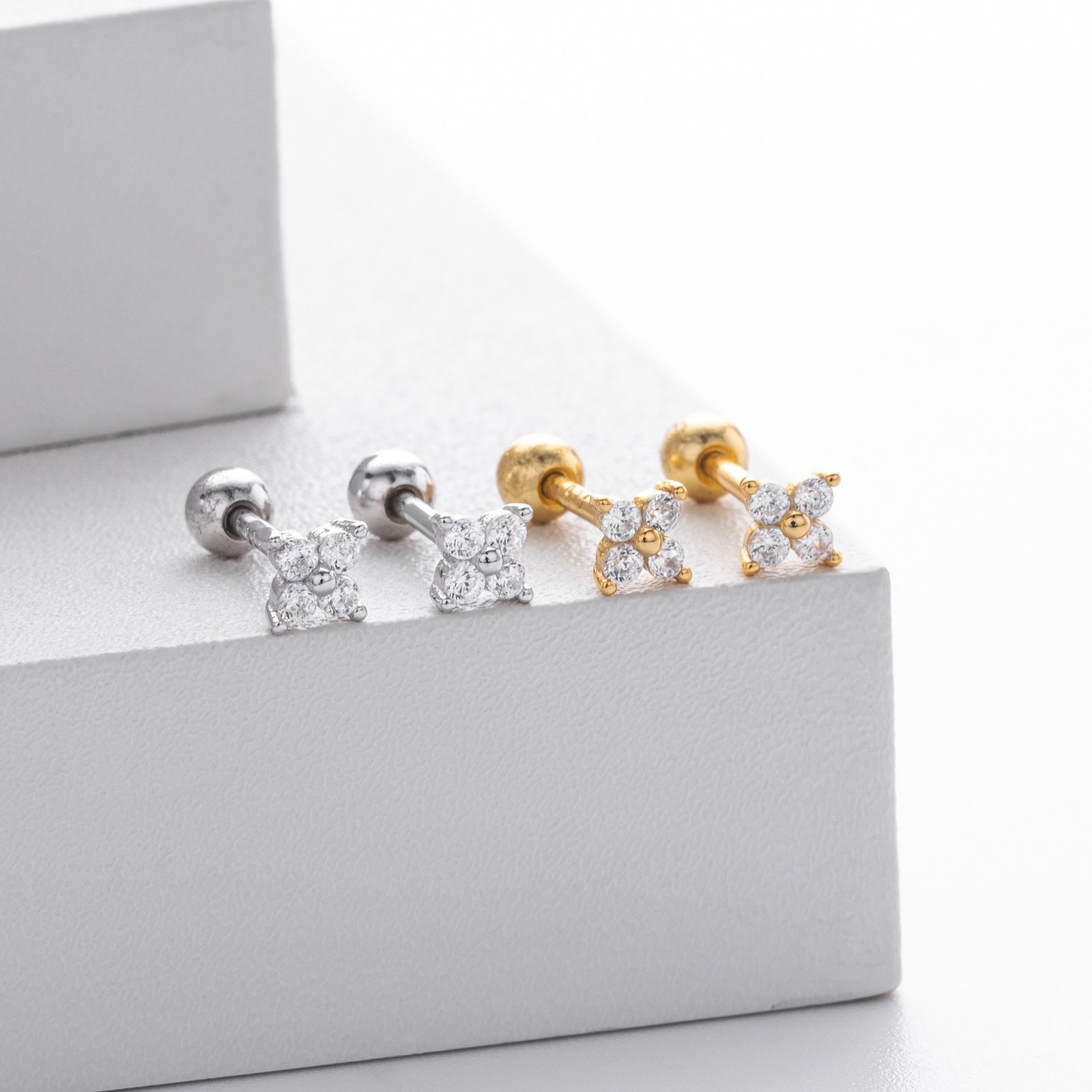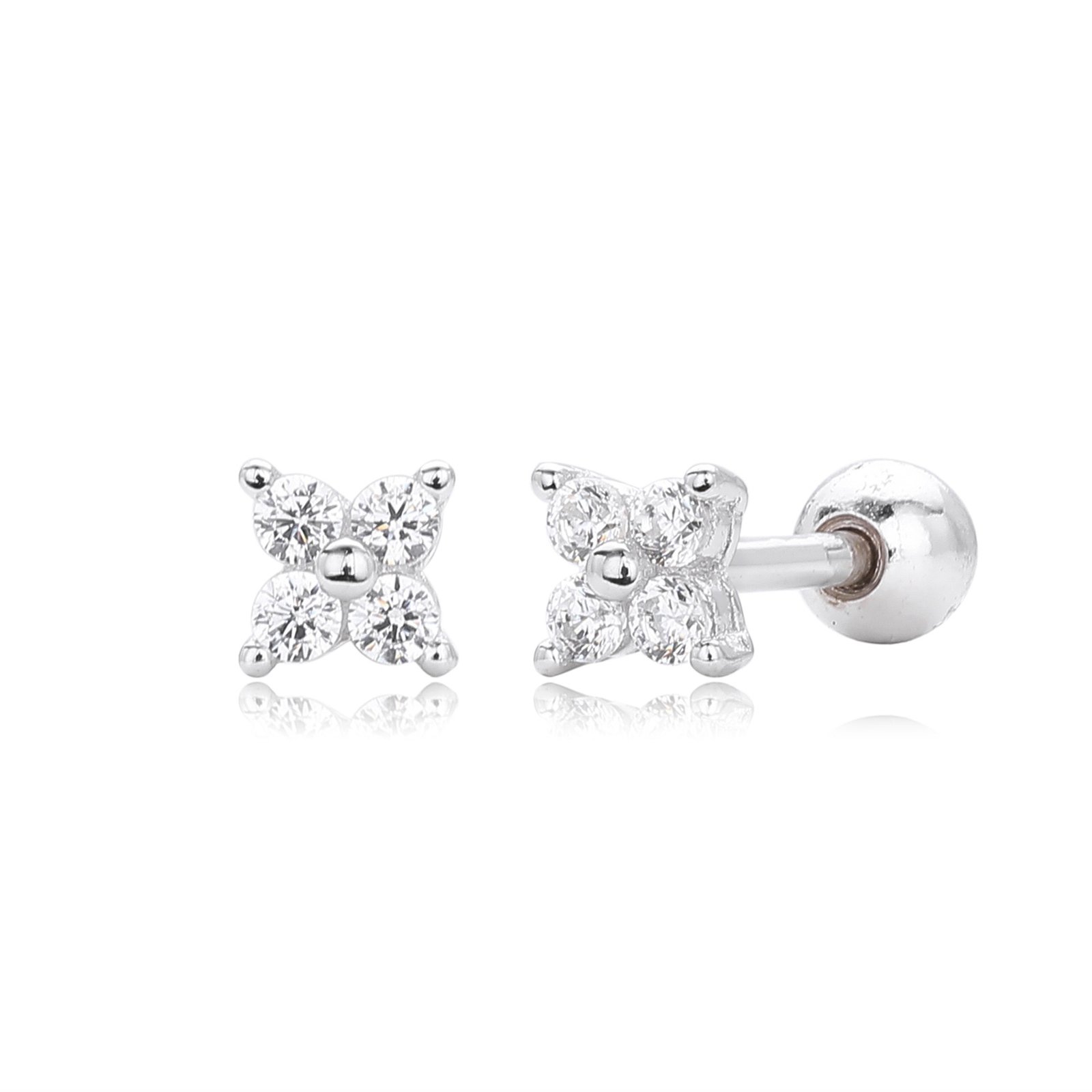 Available in gold and silver, these mini earrings are crafted from S925 sterling silver or S925 silver plated with 18K gold, set with four sparkling lab-grown diamonds arranged in a dainty diamond-shaped flower.